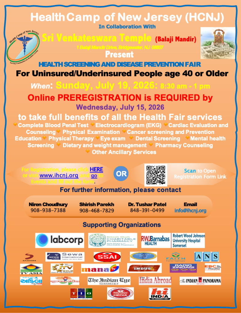 EventsIHCNJ2026-04-15T14:05:04+00:00 2026 Health Screening Camp ScheduleJuly 17 -Balaji Temple & Cultural Center – 1 Balaji Temple Drive, Bridgewater Registration is OPEN now.Sept 13 – Durga Mandir Hindu Temple, 4240 Route, 27, PrincetonNov 15 – Shree Swaminarayan Temple, 200 Swamibapa Way, Secaucus Upcoming Events Click Here to Register for the JULY 19, 2026 Camp at Balaji Mandir